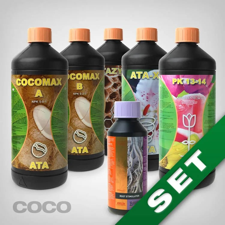Das Hauptelement des Kokos-Sets besteht aus dem Kokos-Kombidünger Coco Max A & B, welcher optimal auf die besonderen Erfordernisse von Kokossubstraten zugeschnitten ist. Die Komponenten A und B werden zu gleichen Teilen im Gießwasser vermischt und sowohl während der Wuchs- als auch während der Blütephase gegeben. Damit sind die Grundbdürfnisse der meisten schnell wachsenden Kulturpflanzen auf Kokossubstrat gedeckt.
