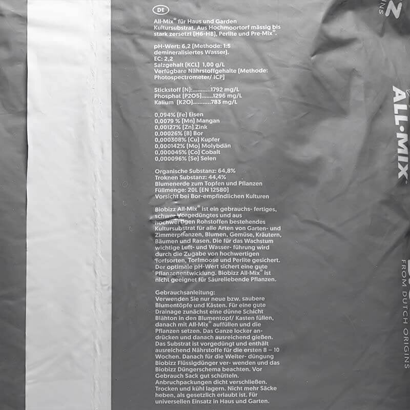 Biobizz All·Mix ist eine vorgedüngte Erde, bei deren Entwicklung sehr viel Wert darauf gelegt wurde, das Ökosystem von Außenerde nachzuvollziehen und daraus zu profitieren. Diese Erde macht das Verwenden eines Düngemittels zweitrangig und kann auch über lange Zeiträume hochwertige Nährstoffe für deine Pflanzen bereitstellen. Neben Kompost und Perlit befindet sich eine eigens entwickelte biologisch aktive Vormischung in der Erde. Durch diese Kombination sind deine Pflanzen für sehr lange Zeit optimal versorgt.