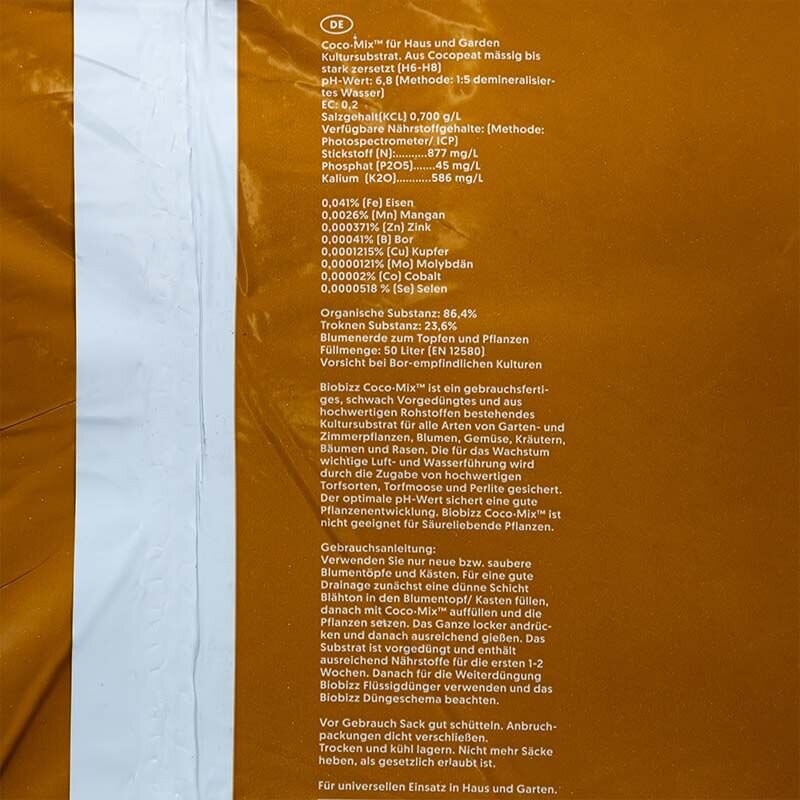 Biobizz Coco Mix ist leicht vorgedüngt und ist auf einen pH Wert von 6,2 eingestellt. Kokossubstrat entsteht als Abfallprodukt der Kokosnussindustrie und wird durch einen aufwändigen Prozess für die Anzucht von Pflanzen optimiert. Der pH Wert beträgt ohne Düngereinfluss 5 bis 6. Coco Mix wird auch oft verwendet, um herkömmliche Erden wie Light Mix oder All Mix aufzulockern und aufzufrischen.