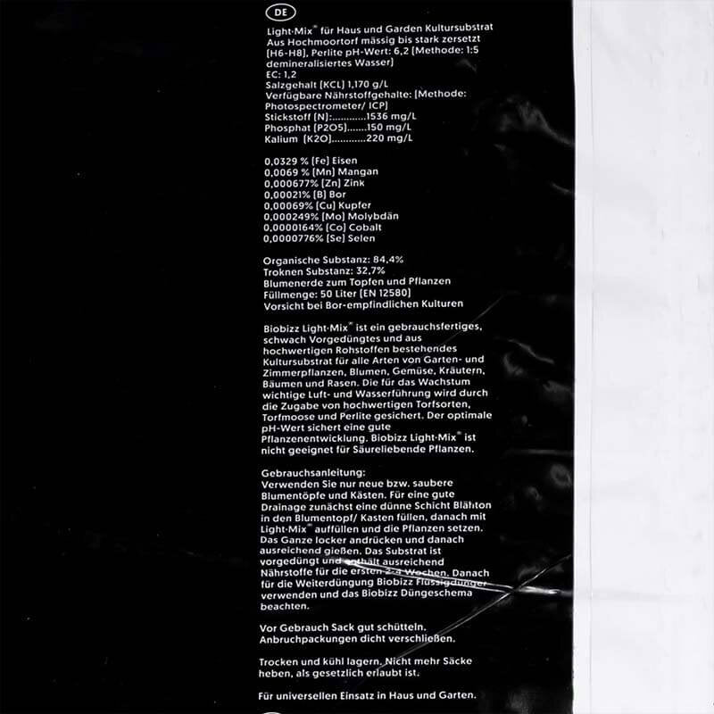 Durch die perfekt eingestellten pH- und EC-Werte kannst du Biobizz Light Mix direkt verwenden. Um Light Mix zu produzieren verwendet Biobizz ausschließlich organische Komponenten von höchster Qualität. Durch die beigemischten Perlite enthält Light Mix auch im nassen Zustand noch genügend Sauerstoff.