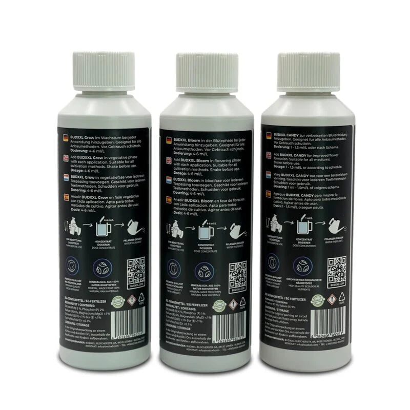 Die BUDXXL Grow Box bietet dir ein effektives Komplettpaket für die Nährstoffversorgung deiner Pflanzen über alle Wachstumsphasen hinweg – von der Keimung bis zur Ernte. Enthalten sind drei perfekt aufeinander abgestimmte Produkte: Grow für die vegetative Phase, Bloom für kräftige Blütenbildung und Candy zur Verbesserung von Geschmack und Aroma. Egal ob du auf Erde, Coco oder Hydro anbaust – die Grow Box liefert eine ausgewogene, mineralische Nährstoffversorgung mit hochwertigen, natürlichen Rohstoffen.