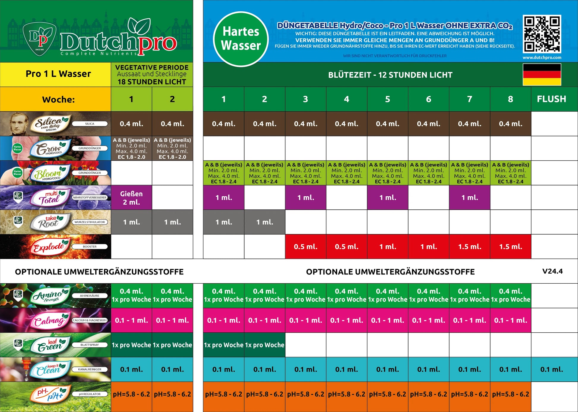 Die HW-Version von Hydro/Cocos Bloom A und B ist für die Anwendung bei unbehandeltem Leitungswasser gedacht. Dies ist oft relativ hart bzw. hat schon einen recht hohen EC-Wert. Wenn Du sehr weiches Leitungswasser, Regenwasser oder Wasser aus der Umkehrosmose verwendest, solltest Du die SW-Version dieses Düngers verwenden. DutchPro Original Hydro/Cocos Bloom A und B wurde entwickelt, um EC-Werte bis 2,4 zu erreichen.