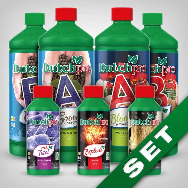 Wenn Du gerade erst mit dem Growen beginnst oder die Top-Produkte von Dutch-Pro einmal testen willst, ist das Starter-Set Hydro/Cocos eine gute Wahl. Es ist gedacht für Grows auf Cocos-Substraten oder mit Hydrosystemen und der Verwendung von hartem Gießwasser (z. B. Leitungswasser). Im Set enthalten sind ein 2-Komponenten-Volldünger für Wachstums- und Blütephase sowie drei kraftvolle Booster.