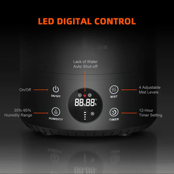 Dank des 6-Liter-Tanks kann der Luftbefeuchter bis zu 22 Stunden ununterbrochen arbeiten, ohne dass du Wasser nachfüllen musst. Dadurch bleibt die Luftfeuchtigkeit konstant, was besonders für größere Anbauflächen von Vorteil ist. Der Luftbefeuchter arbeitet dabei mit einer Leistung von 26 Watt, wodurch er energiesparend und effizient ist.