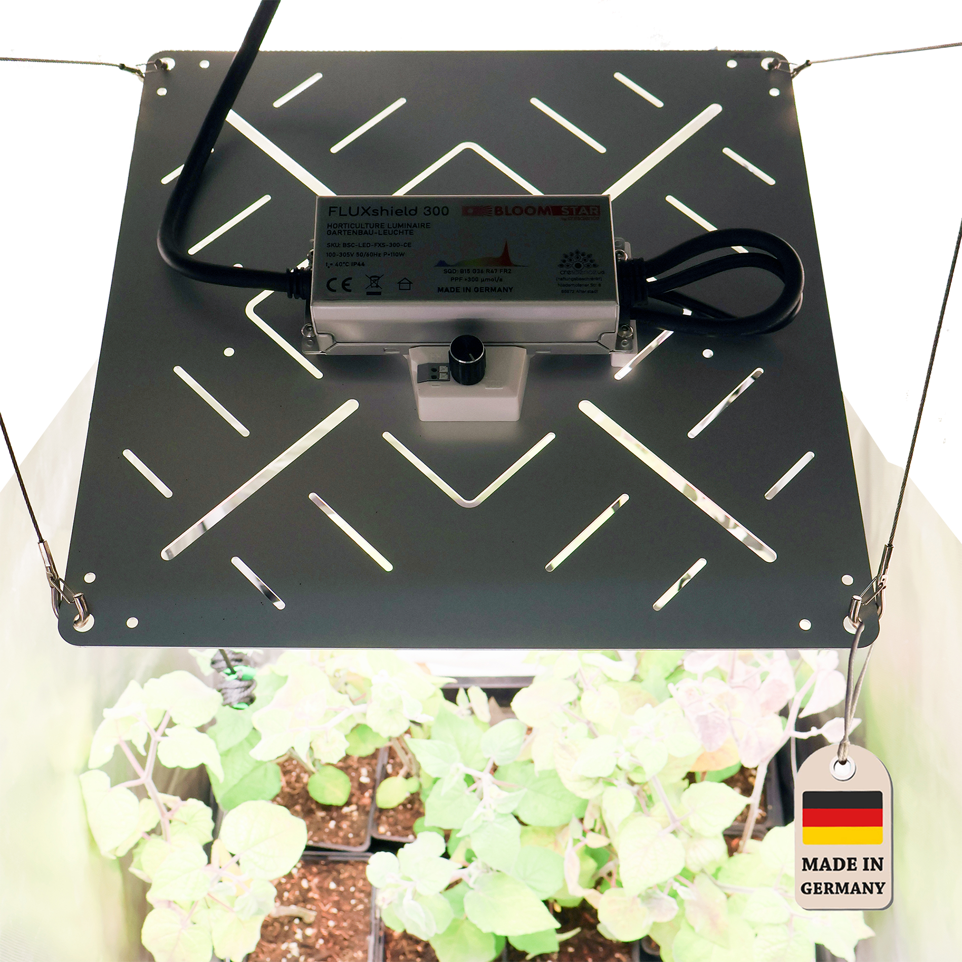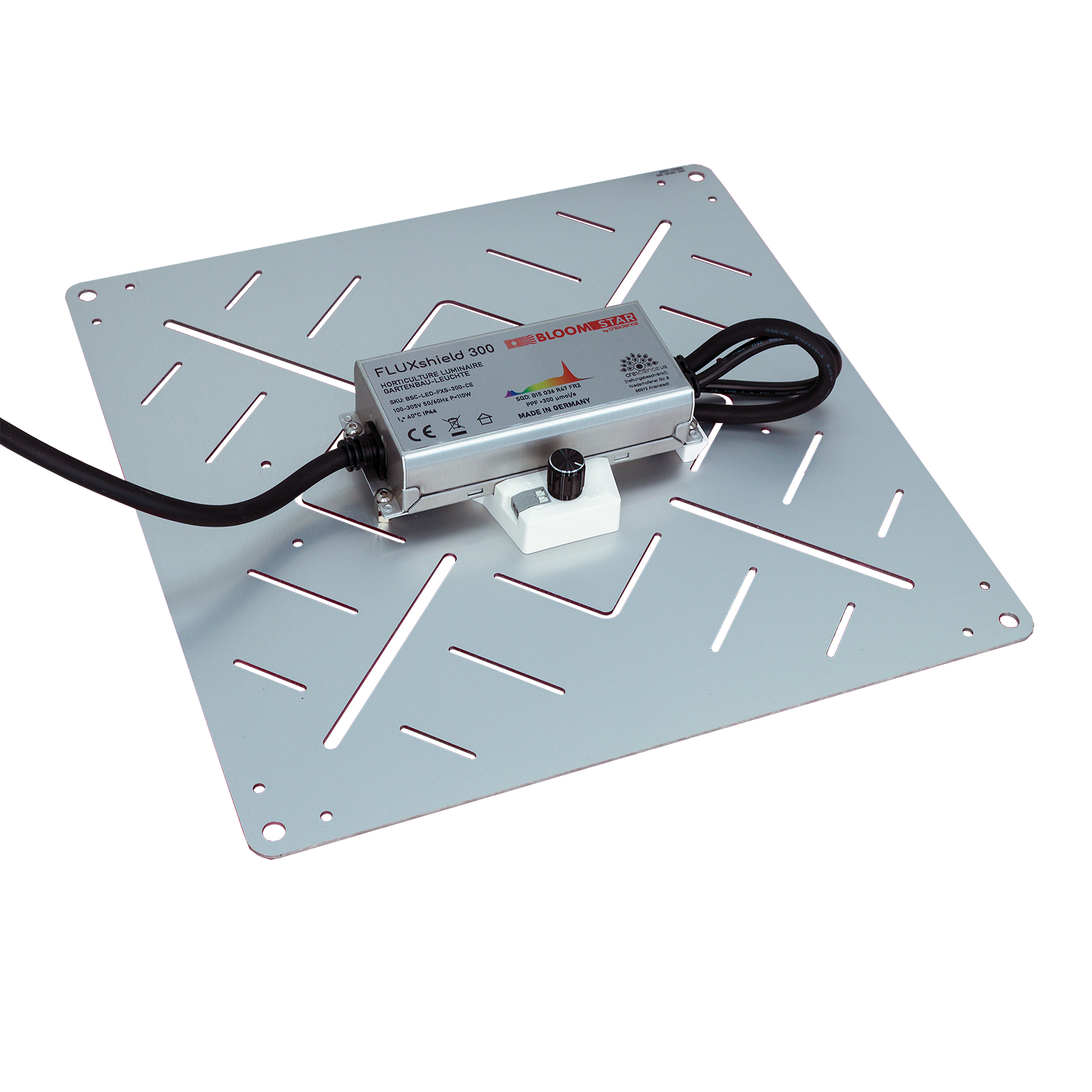 Das FLUXshield 300 ist eine quadratische LED-Leuchte für den Gartenbau. Das verbesserte VollspektrumcSpec Enhanced eignet sich für den gesamten Zyklus. Mit seinem dimmbaren Photonenfluss von über 300 μmol/s