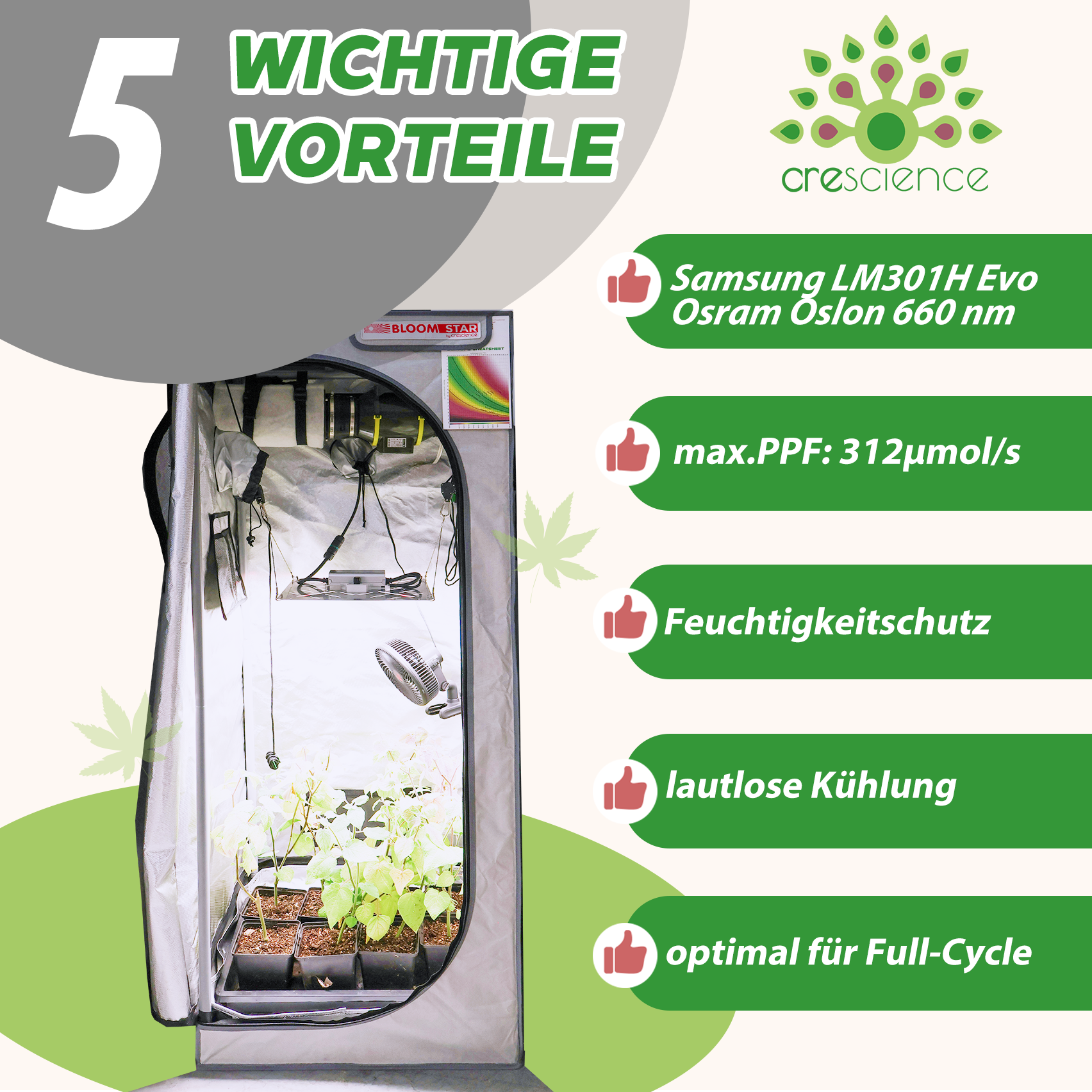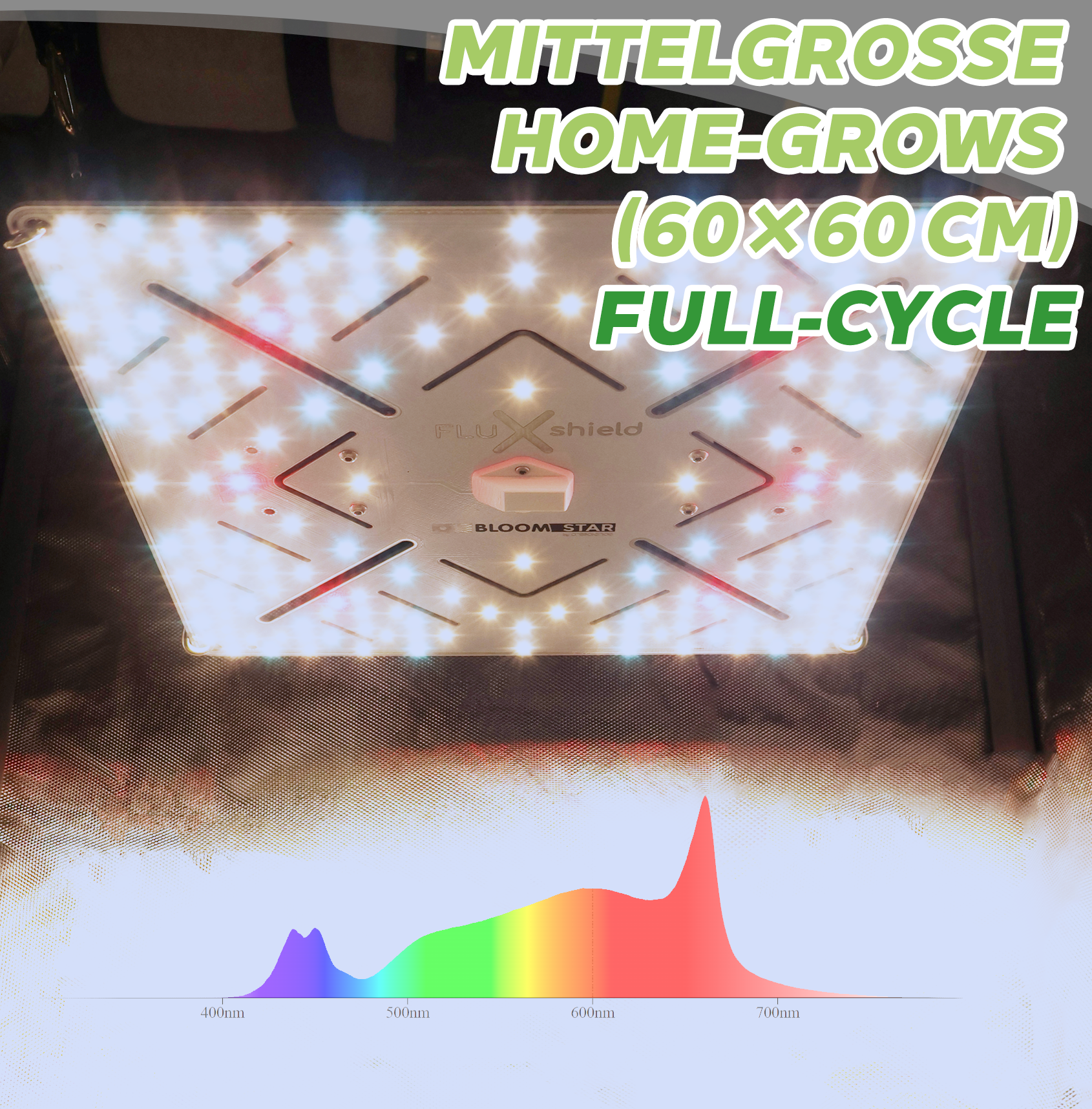 kann auf einer Fläche von 60x60 cm eine Photonenflussdichte (PPFD) von über 800 μmol/(m2 s) erreicht werden.